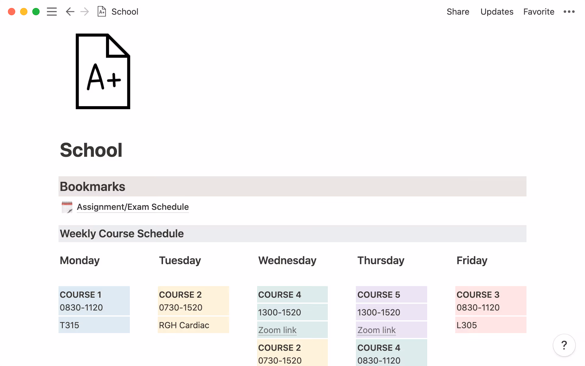 Instead of running through hallways searching for the right classroom, a lot of you might be searching for the right Zoom link. Though this template has a whole other section for work and life, we love the way it lays out your weekly class schedule and makes Zoom links easy to access.