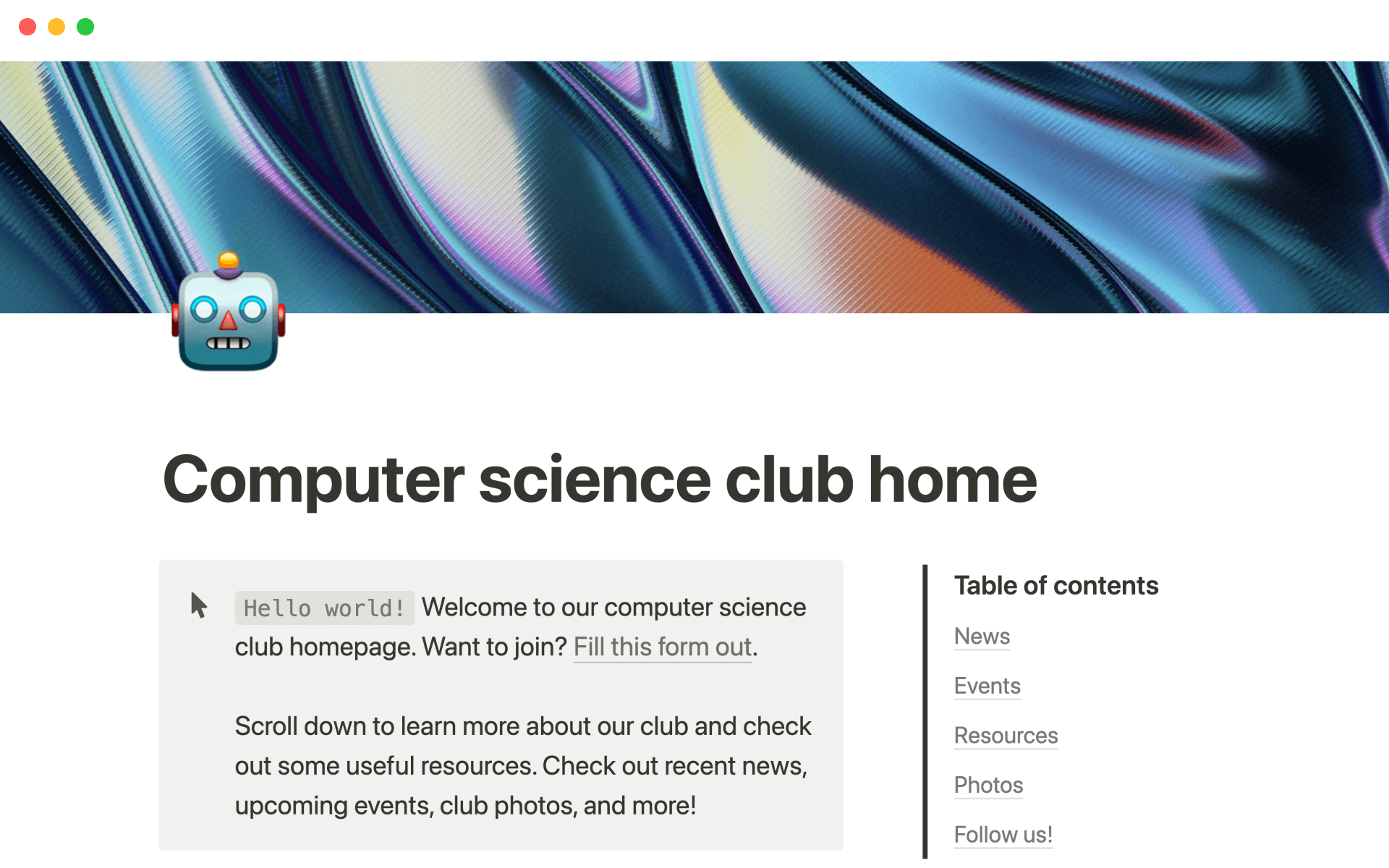 School isn't just about school these days — if you're running a club or managing a group project, this template can help you capture all of your team's knowledge. You can keep your mission statement, tasks, and sponsorship apps neatly organized in this homepage. Share it with current and future team members so they can find everything they need to push projects forward.