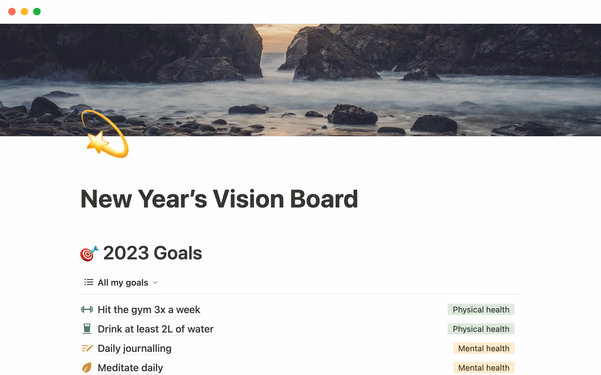 The first step toward having a great next year is to have a clear vision of what you want to achieve. This New Year vision board was created by Notion to help you keep your goals and inspirations top of mind.