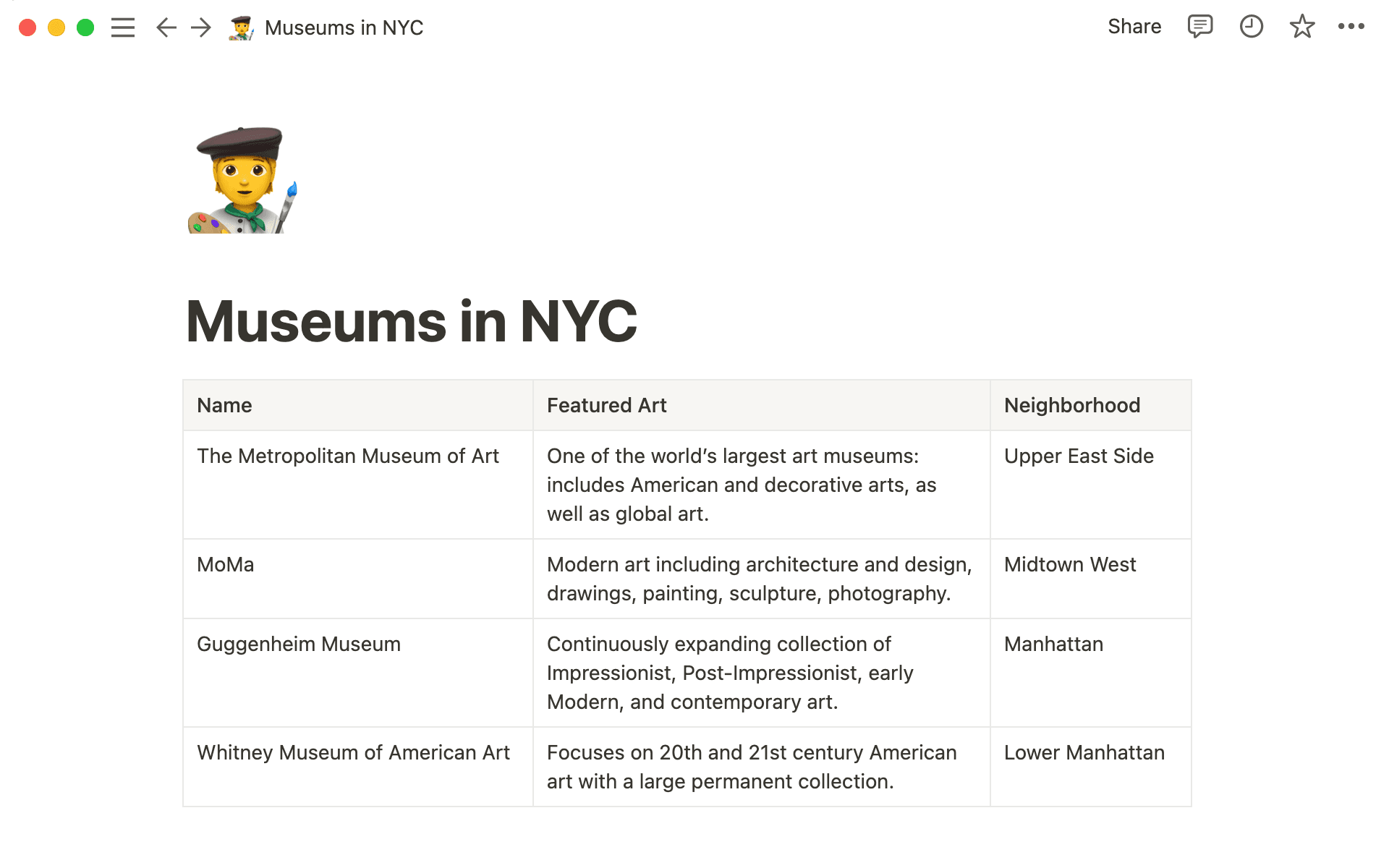 To add a simple table to your page, just type /table. Quickly add more rows & columns by dragging the bottom right corner, and toggle your header row and header column by opening the Options dropdown menu.