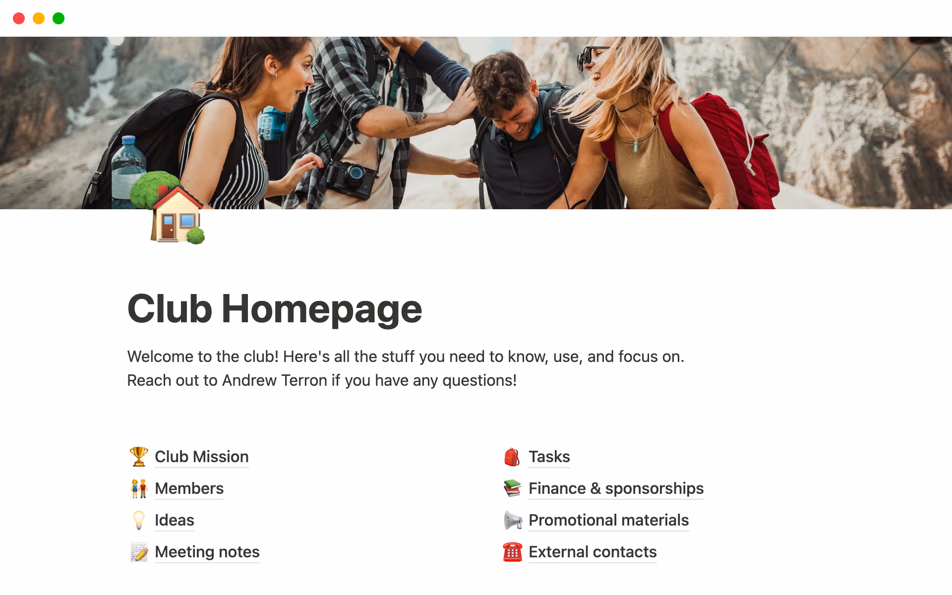 School isn't just about school these days — if you're running a club or managing a group project, this template can help you capture all of your team's knowledge. You can keep your mission statement, tasks, and sponsorship apps neatly organized in this homepage. Share it with current and future team members so they can find everything they need to push projects forward.