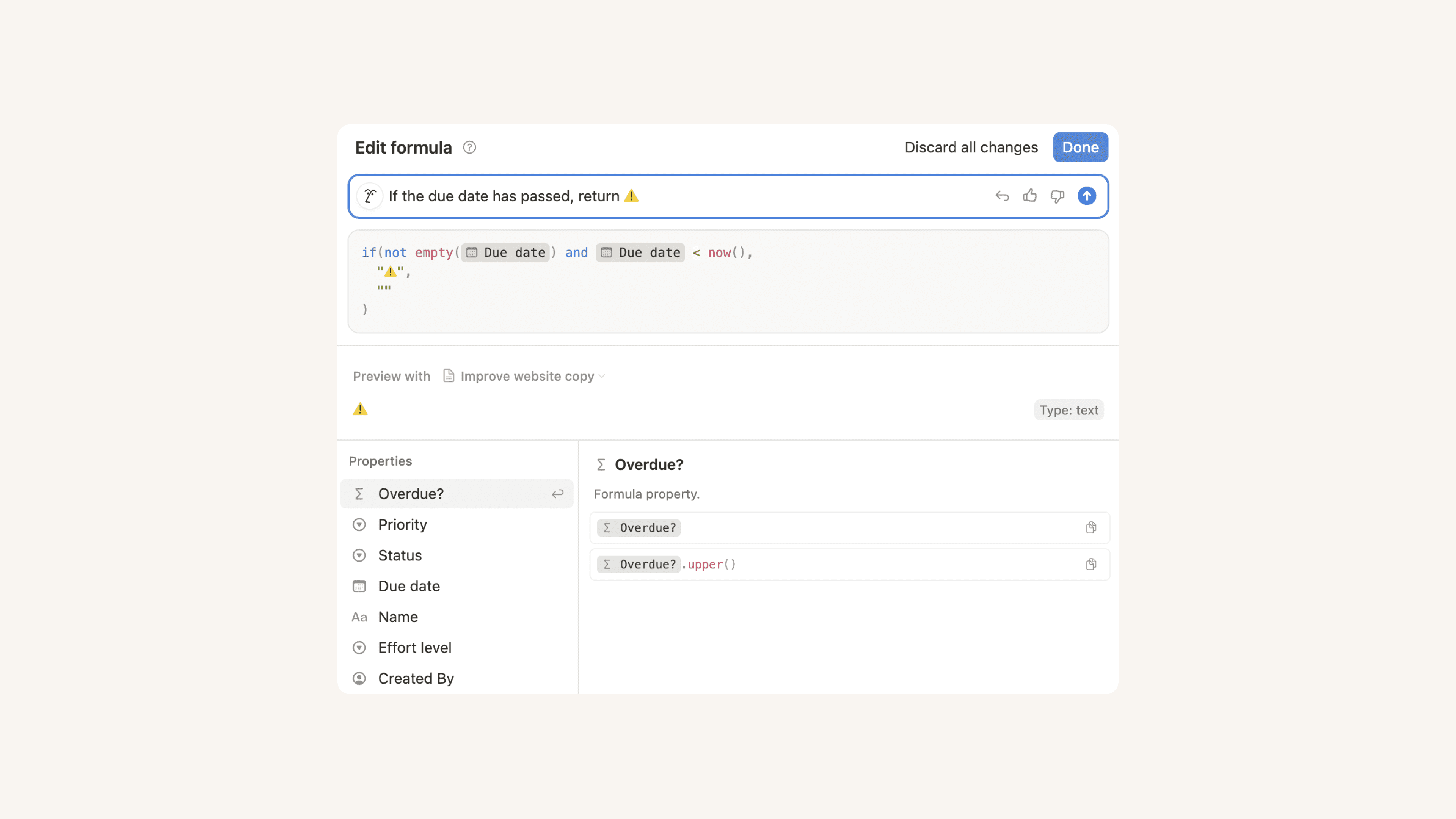 “Make this formula handle edge cases.” (For example, Notion AI could add an if statement so that the formula doesn’t fail when a field is empty.)